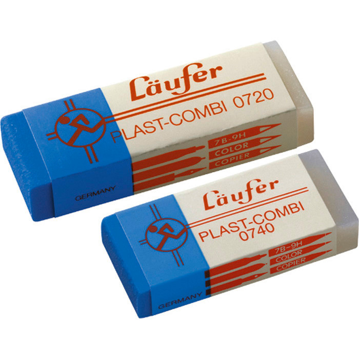 Die Kombination des Allround-Talents Läufer Plast für Blei- und Farbstifte mit dem blauen Spezialradierer für Kugel- und Faserschreiber, Tinte und Tusche.