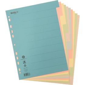 Recycling-Karton Register: Ordnen Sie Ihre Unterlagen schnell und effizient mit den praktischen Registern von Biella. Die farbigen Taben sowie der individuell beschriftbare Index ermöglichen ein schnelles Auffinden Ihrer Dokumente. Für Format A4. 11-fach Lochung, 1. Blatt mit Indexdruck, 200 gm2, nachfolgende Blätter 170 gm2. In Beutel verpackt.