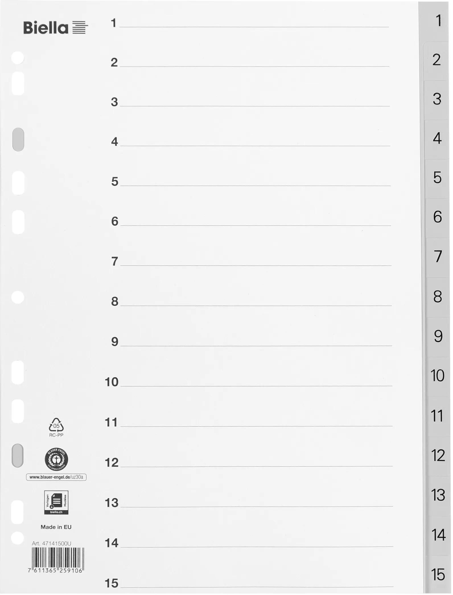 Ordnen Sie Ihre Unterlagen schnell und effizient mit den praktischen Registern von Biella. Die nummerierten Taben sowie der individuell beschriftbare Index ermöglichen ein schnelles Auffinden Ihrer Dokumente