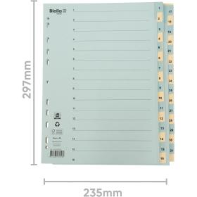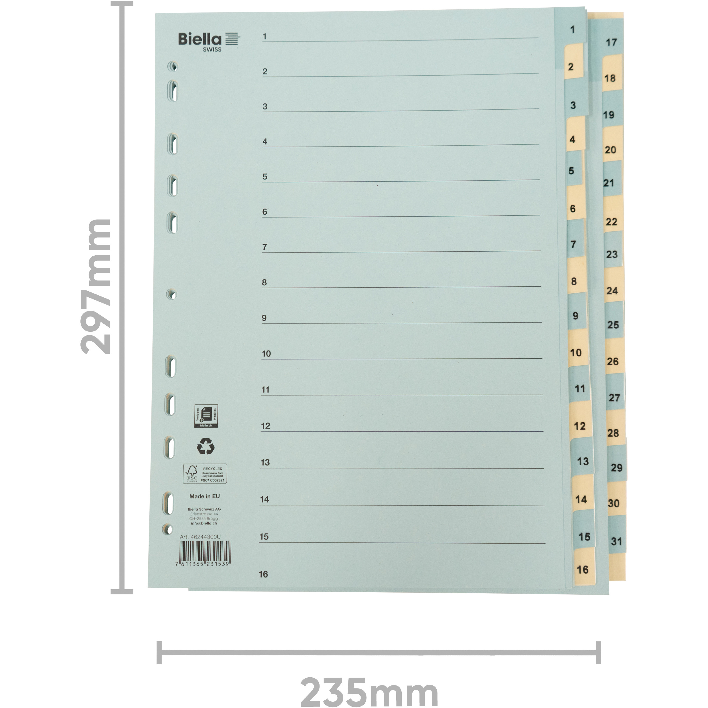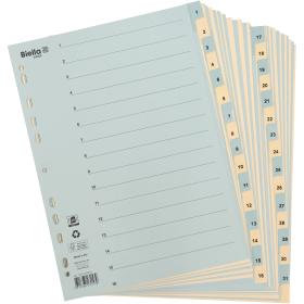 Kartonregister Taben verstärkt: Ordnen Sie Ihre Unterlagen schnell und effizient mit den praktischen Registern von Biella. Die Taben sowie der individuell beschriftbare Index ermöglichen ein schnelles Auffinden Ihrer Dokumente. Für Format A4. 1. Blatt mit Indexdruck, 11-fach Lochung, Taben bedruckt und verstärkt für besonderen Schutz bei intensiver Nutzung. Einzeln in Beutel.
