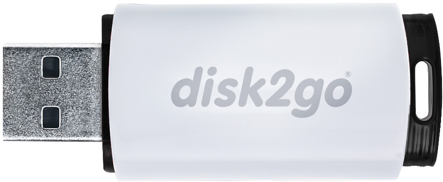 Der disk2go TONE besticht durch sein schlichtes, weisses Gehäuse mit einem bunten Farbeinlass (wechselnd in den Kapazitäten).