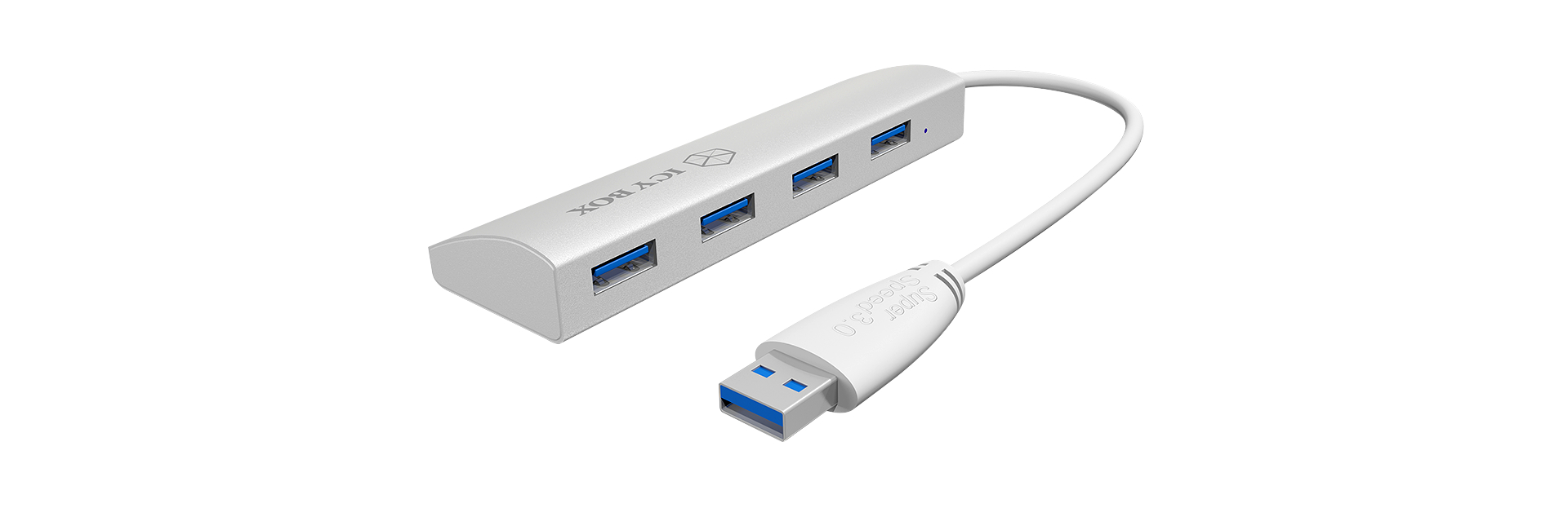 Die IB-AC6401 ist ein unabhängiger Super-Speed USB 3.0 Hub. Das schlanke Design und das integrierte USB 3.0-Kabel machen es ideal für die mobile Nutzung von Mac oder PC-Notebooks. Wenn Sie mal wieder nicht ausreichend USB Steckplätze habe können Sie Ihren PC oder Ihr Notebook um 4 weitere USB 3.0 Schnitt-stellen erweitern. Ein 5 V Stromanschluss erlaubt den Einsatz eines optionalen Netzteils (5 V / 2 A, nicht enthalten) wenn Geräte mit hohem Strombedarf angeschlos-sen werden.