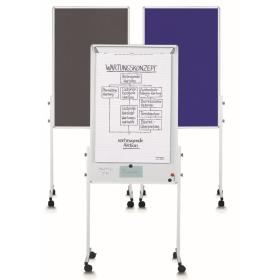 Das multifunktionelle + platzsparende Präsentationsboard für kleinere Büros + Besprechungsräume: Vorderseite = Whiteboard + Flipchart. Mit weisser, magnethaftender Schreibtafel-Oberfläche, inkl. Papierhalter. Auf alle Papier-Grössen einstellbar. Rückseite = Pinnboard. Mit blauer oder grauer Filzoberfläche zum Anpinnen. Mit eloxiertem Aluminiumrahmen in lichtgrau. Mobil durch 4 Laufrollen.