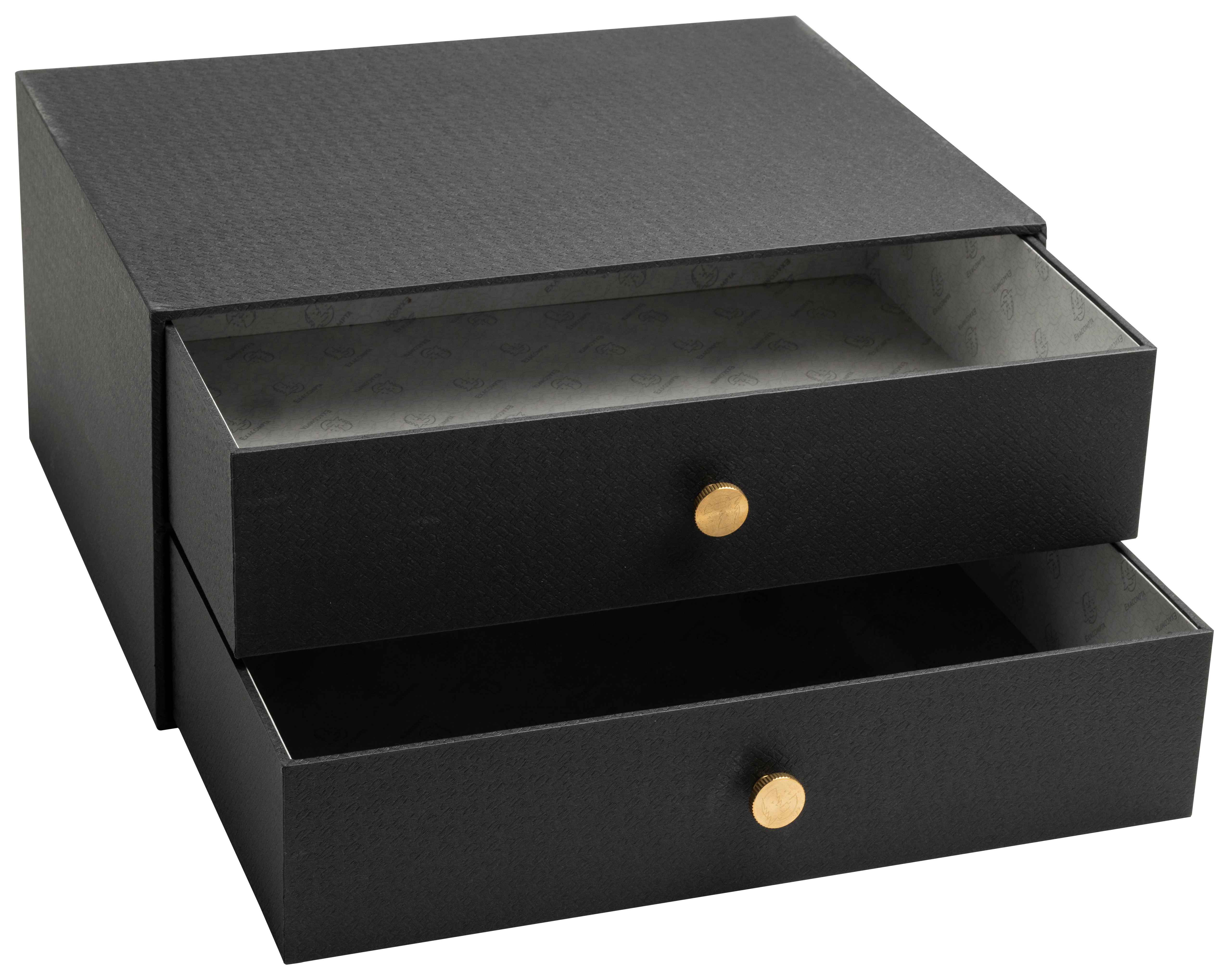 Schubladenbox, 2 Schubladen, 17x35,5x27 cm für DIN A4 Maxi, Office by me Exacompta entwickelt seit jeher Organisationslösungen, die auf die Bedürfnisse jedes Einzelnen zugeschnitten sind, um die persönlichen oder beruflichen Erfolg zu begleiten. Bei seinen innovativen Produktentwicklungen achtet Exacompta auf eine umfassende Umweltstra tegie. OfficeByMe ist Exacomptas erste plastikfreie Serie von Büroaccessoires, die vollständig aus FSC®-zertifiziertem Karton und Papier hergestellt wird. Die Produkte werden aus Recyclingkarton hergestellt, der mit einem Papier mit Textileffekt überzogen ist, einem pflanzlichen Monomaterial, das das Recycling erleichtert. Das Modul mit 2 Schubladen ist im Format A4+ konzipiert, um Akten und Sammelmappen mit Gummizug aufbewahren zu können. Das Produkt eignet sich daher sowohl für den beruflichen als auch für den privaten Gebrauch. Es kann einzeln oder zu zweit übereinander gestapelt verwendet werden, um eine höhere Ablagekapazität zu erreichen. Hochfester Karton 3mm, leichtgängige Schubladen mit Goldknopf. Innen Papier mit Logo ohne Plastik.