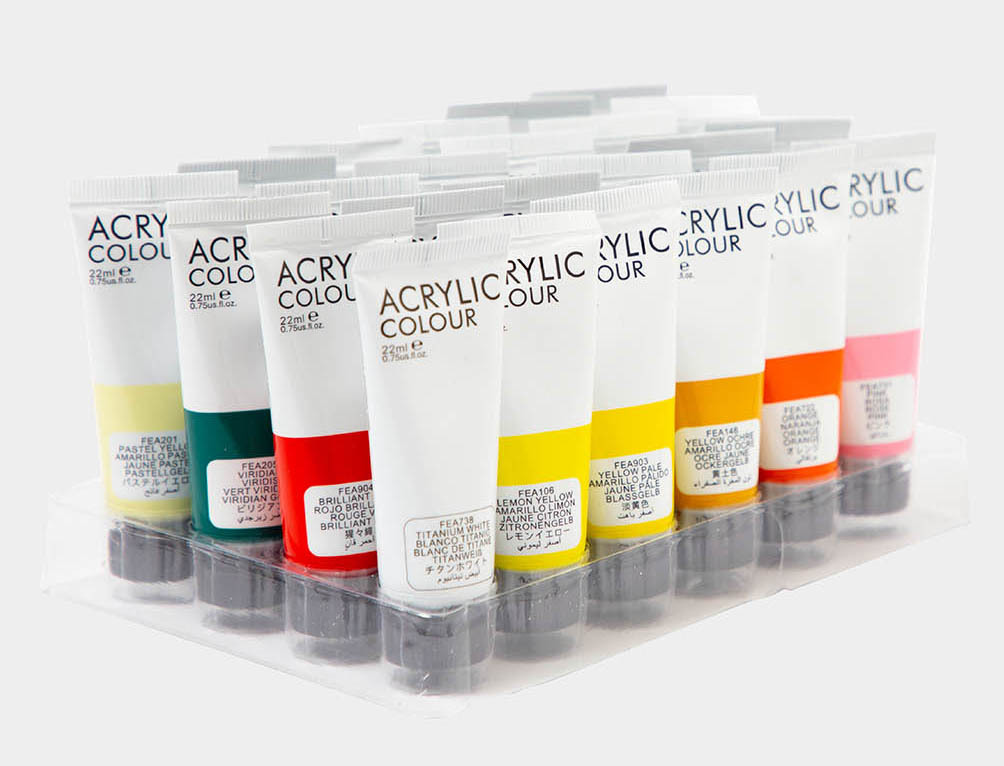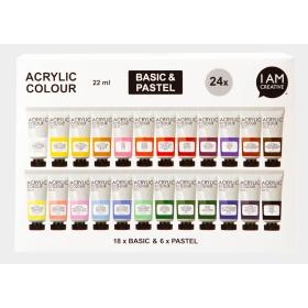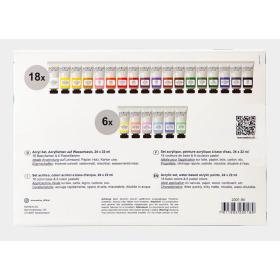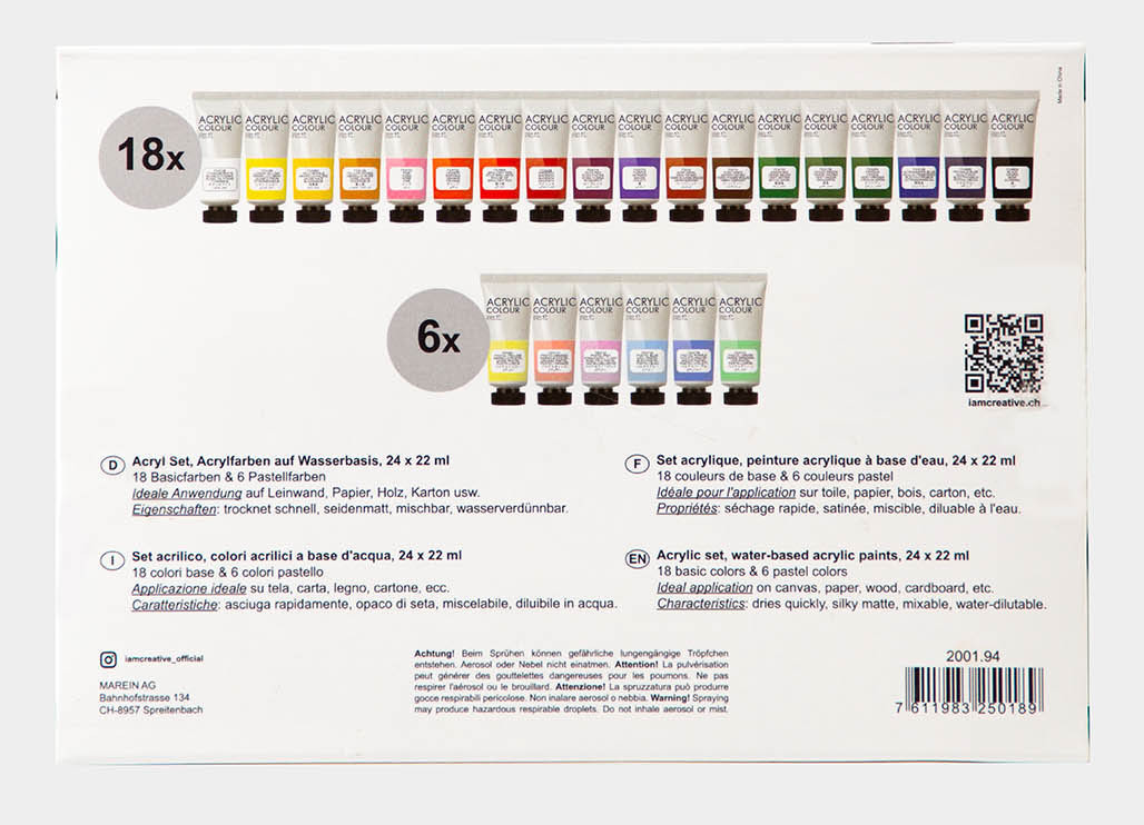 Das 24-teilige Acryl-Set ist die ideale Wahl für kreative Projekte und Kunstwerke. Es enthält 18 Basicfarben und 6 Pastellfarben, die Anfängern und Fortgeschrittenen einen perfekten Einstieg in die Acrylmalerei bieten. Die breite Farbpalette ermöglicht es, künstlerische Fähigkeiten voll zu entfalten und beeindruckende Ergebnisse zu erzielen. Die hochpigmentierten Acrylfarben in Studienqualität sind wasserbasiert, gut deckend, schnell trocknend und lichtecht. Nach dem Trocknen sind sie wasserfest, überlackierbar und flexibel. Sie lassen sich leicht mit Wasser verdünnen und untereinander mischen, was eine vielfältige Farbpalette ermöglicht. Die Herstellung aus reinsten Pigmenten sorgt für einen dauerhaften, wasserfesten und flexiblen Farbfilm. Die Farben trocknen seidenmatt auf, sind ungiftig und umweltfreundlich, ideal für Anfänger und Schüler. Das Set eignet sich für Leinwand, Papier, Holz und Karton. Die Acrylfarben bieten hervorragende Deckkraft und Farbkonsistenz, perfekt für verschiedene Maltechniken. Mit Pinsel und Farbroller lassen sich sowohl feine Details als auch grosse Flächen bearbeiten. Der Inhalt umfasst 24 Farben à 22 ml in den Tönen Titanweiss, Zitronengelb, Blassgelb, Ockergelb, Pink, Orange, Brillantrot, Magenta, Rosenrot, Violett, Sienna gebrannt, Umbra gebrannt, Pastellgelb, Pastellorange, Pastellblau, Pastellviolett, Pastellgrün, Mittelgrün, Grasgrün, Viridian Grün, Ultramarinblau, Phthaloblau und Schwarz. # 24-teiliges Acryl-Set, hochpigmentierte Acrylfarben, Studienqualität Acrylfarben, schnelltrocknende Acrylfarben, lichtechte Acrylfarben, wasserbasierte Acrylfarben,ungiftige Acrylfarben, umweltfreundliche Acrylfarben, Acrylfarben für Anfänger, Acrylfarben für Schüler, flexibler Farbfilm, überlackierbare Acrylfarben, Acrylfarben auf Leinwand, kreative Projekte mit Acrylfarben, mehrschichtige Acrylmalerei.