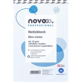 Der novooo Notizblock aus Recyclingpapier mit 100 Blatt ist 4 mm kariert und ist mit einer Mikroperforation versehen, damit die Notizblätter ganz einfach abgetrennt werden können. Der Block hat eine Grammatur von 70 g/m2. Das Titelblatt ist abreissbar.