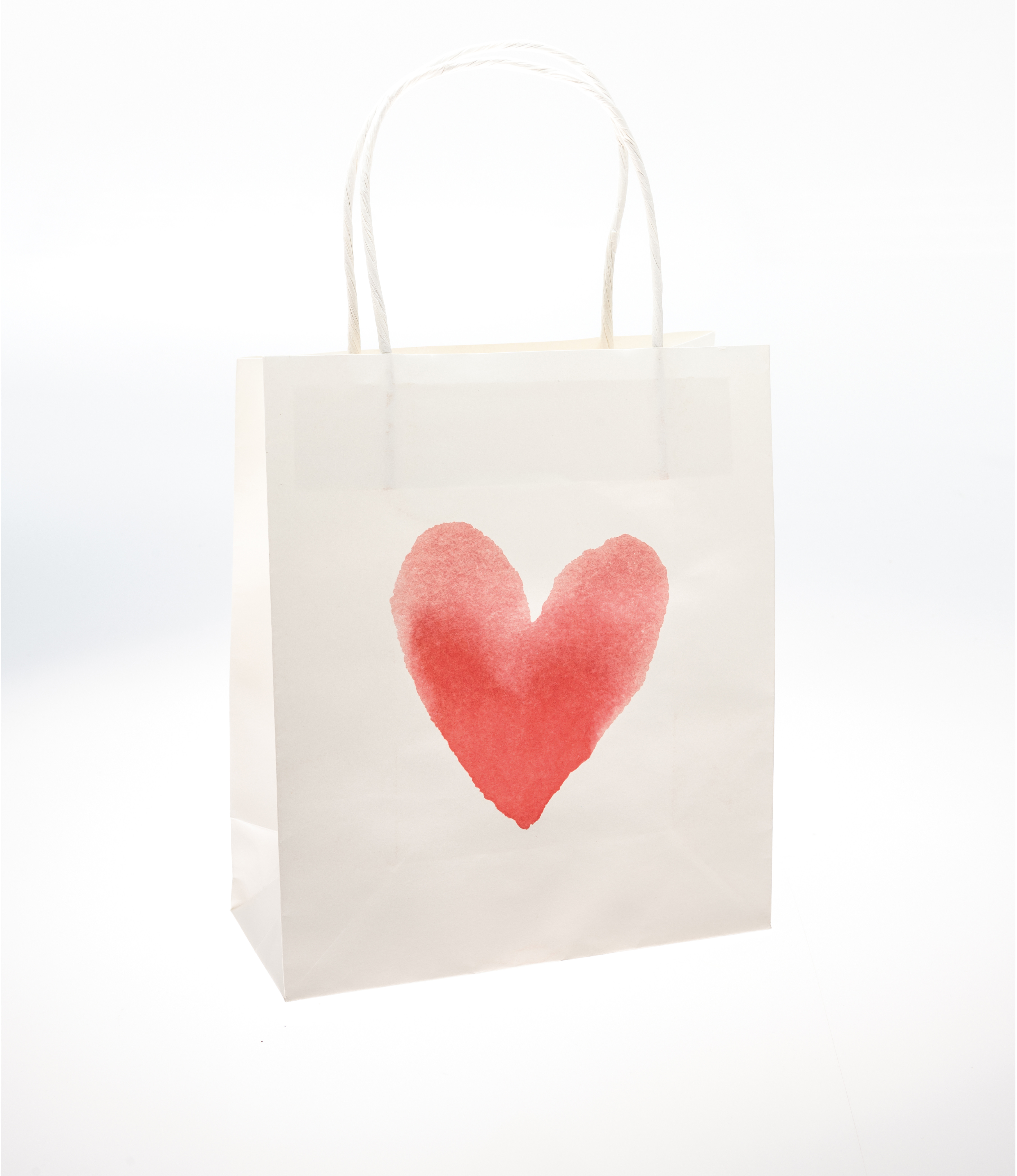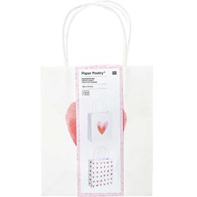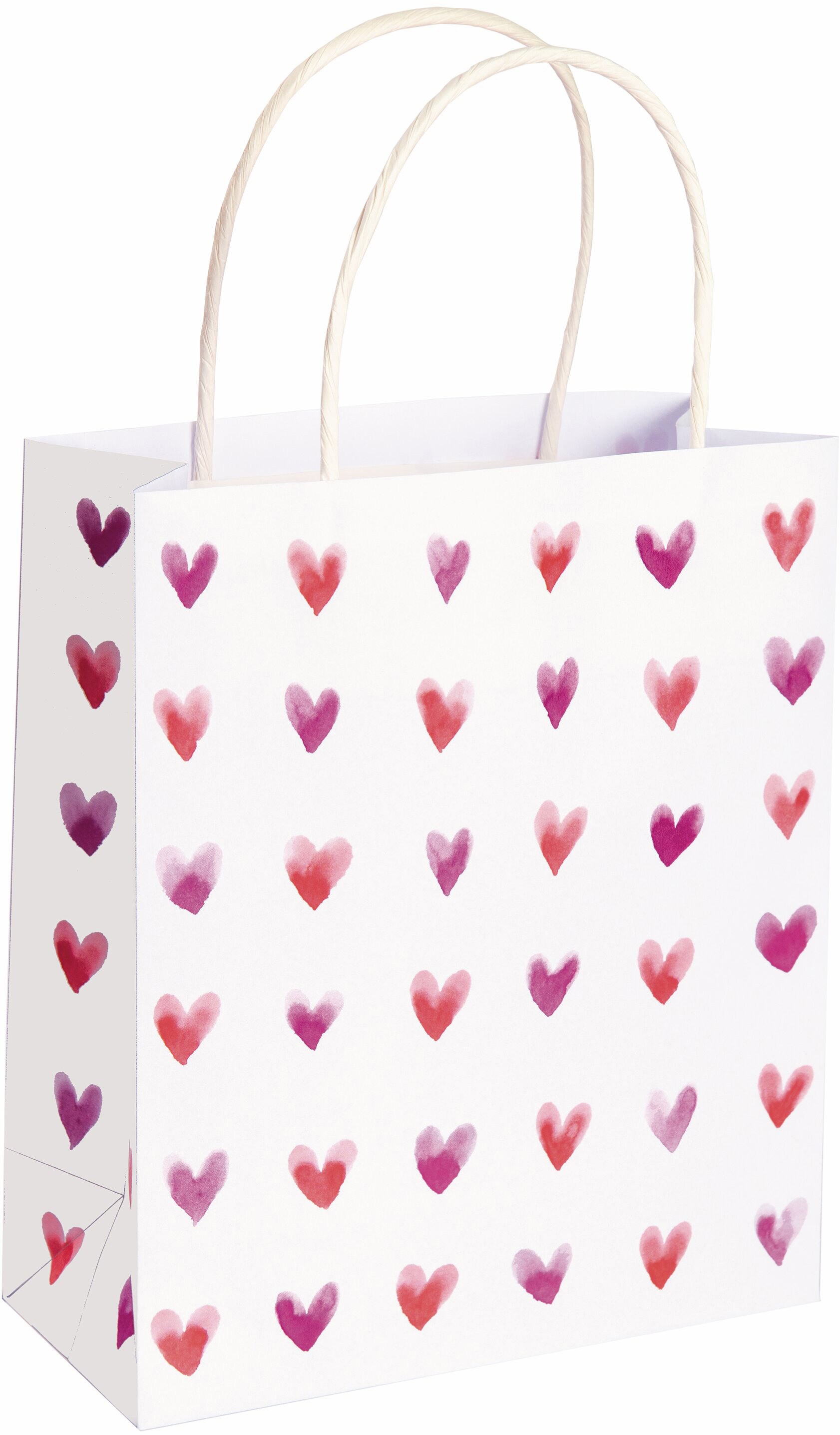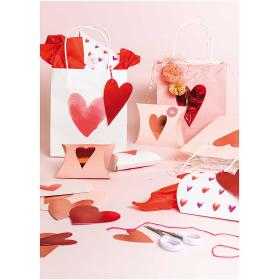 Für Geschenke, die von Herzen kommen: die weissen Papiertüten mit aquarillierten Herzen. Eine Tüte hat ein schlichtes rotes aquallieriertes Herz. Die zweite Tüte hat viele kleine aquallirierte Herzen in rot und lila Tönen. Damit ist das Verpacken von Geschenken kinderleicht!