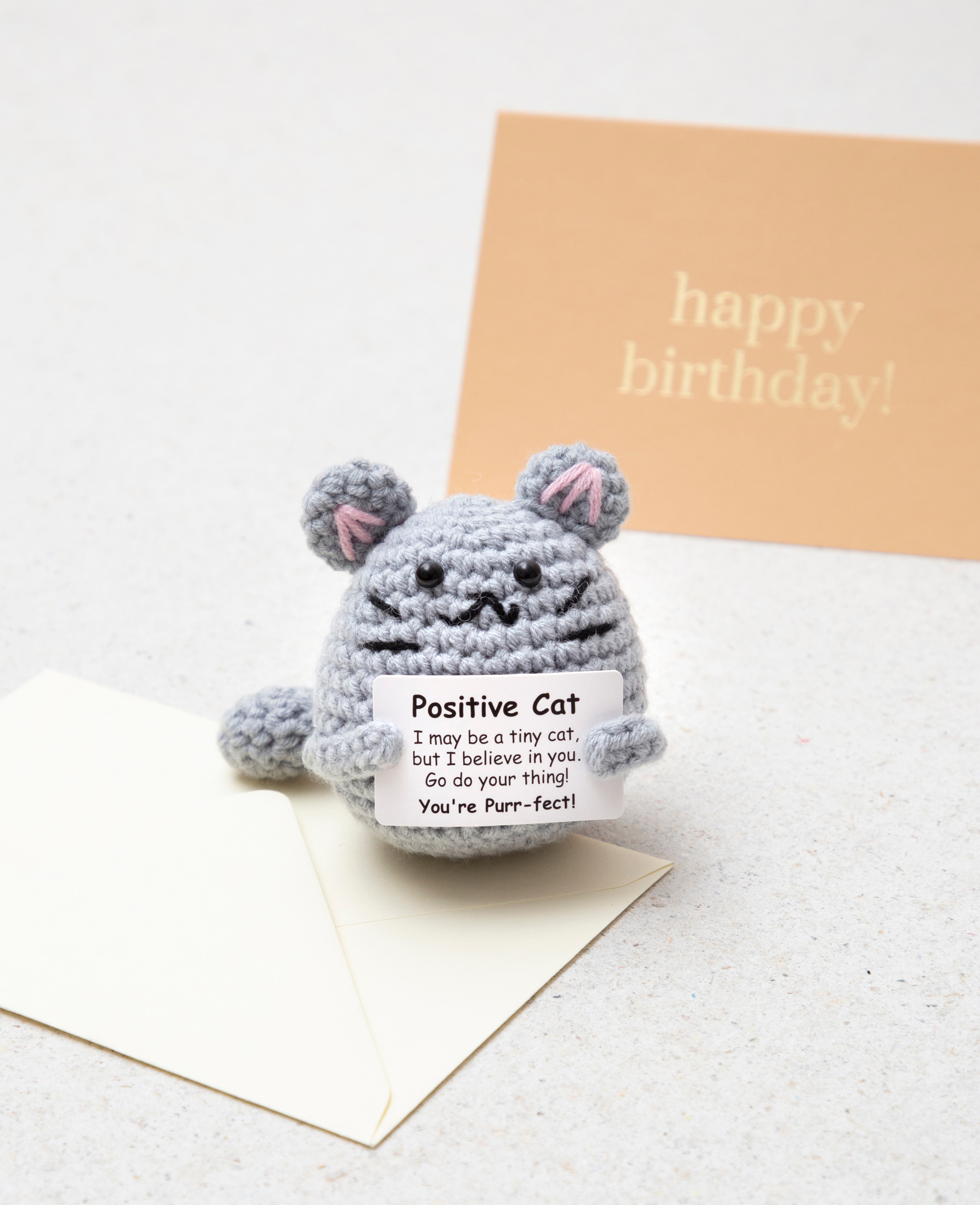 Du suchst nach einem originellen Geschenk? Dann bestelle dir noch heute diese niedliche Positive Cat! Das gehäkelte Plüschtier ist ideal als Geschenk, Aufmunterung oder Glücksbringer geeignet. Stelle die Katze auf deinen Schreibtisch, deinen Nachttisch oder nehme sie mit zu wichtigen Prüfungen. Schenke das Mini Kuscheltier einem Menschen, der dir wichtig ist und zaubere ihm ein Lächeln ins Gesicht!