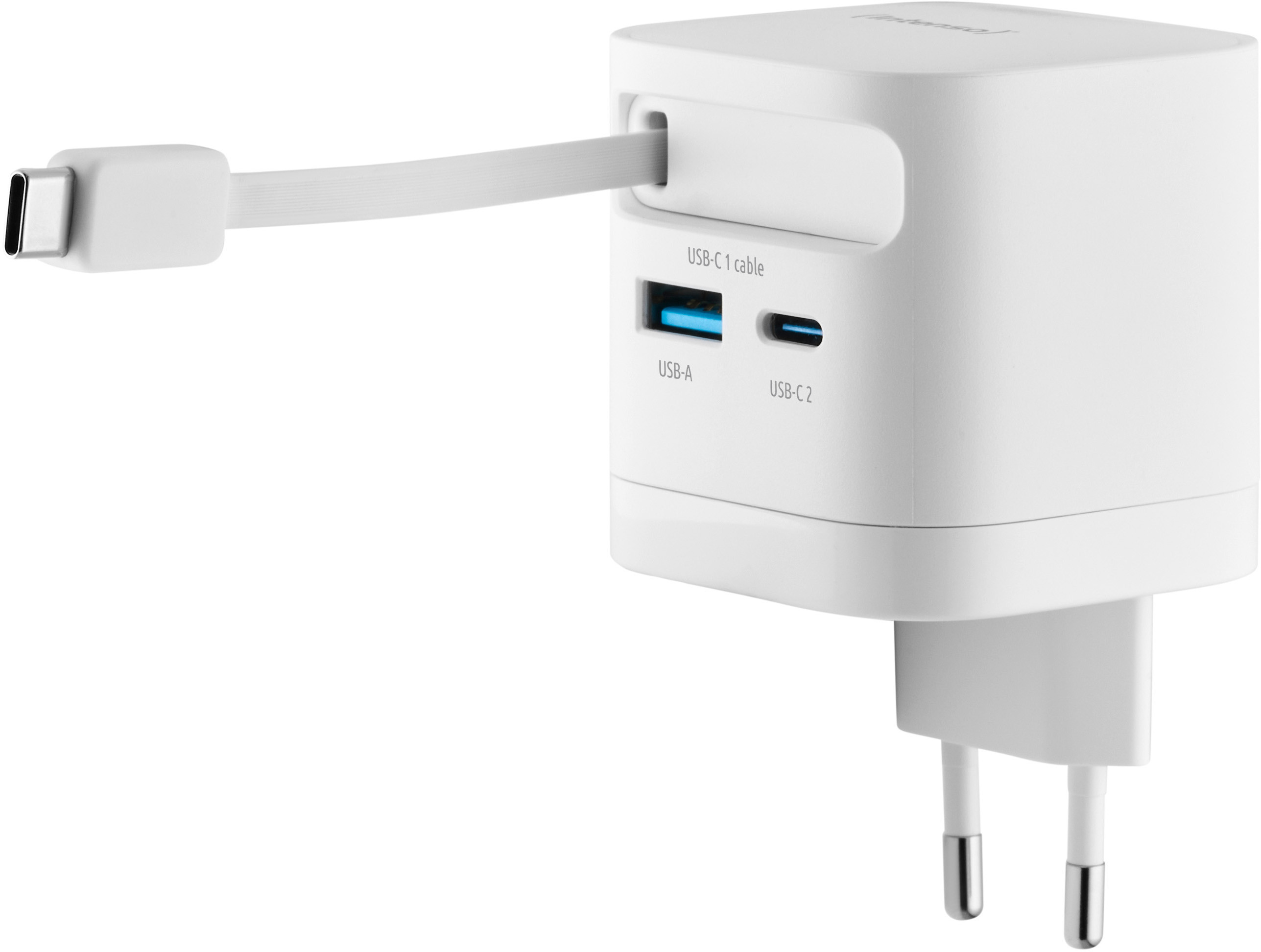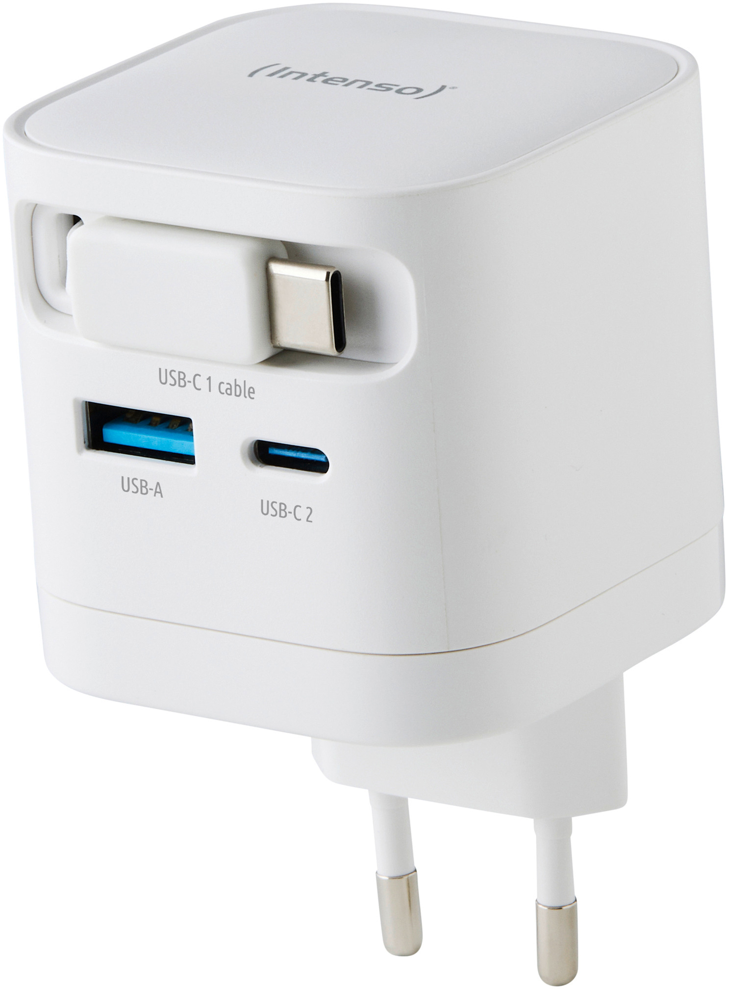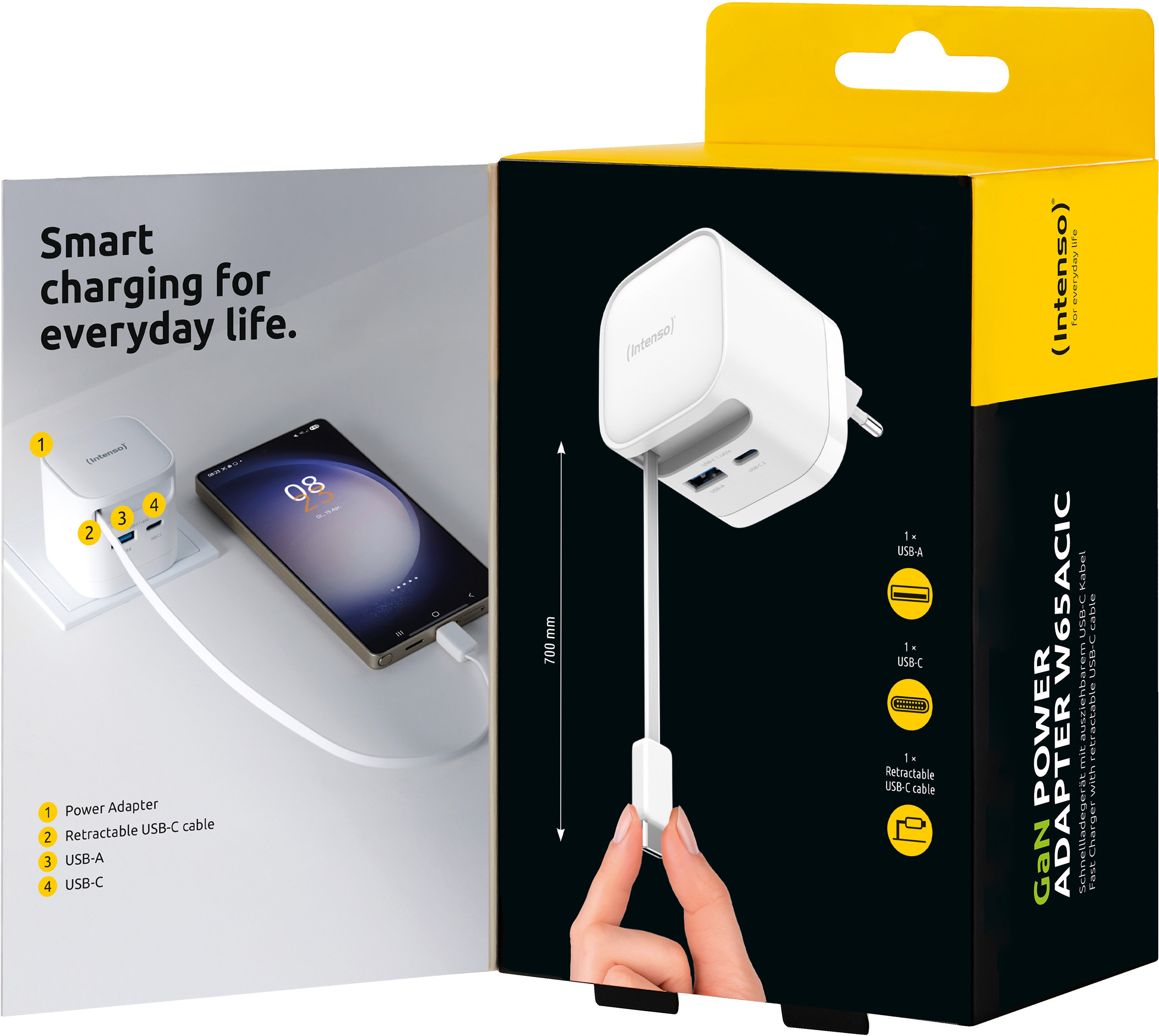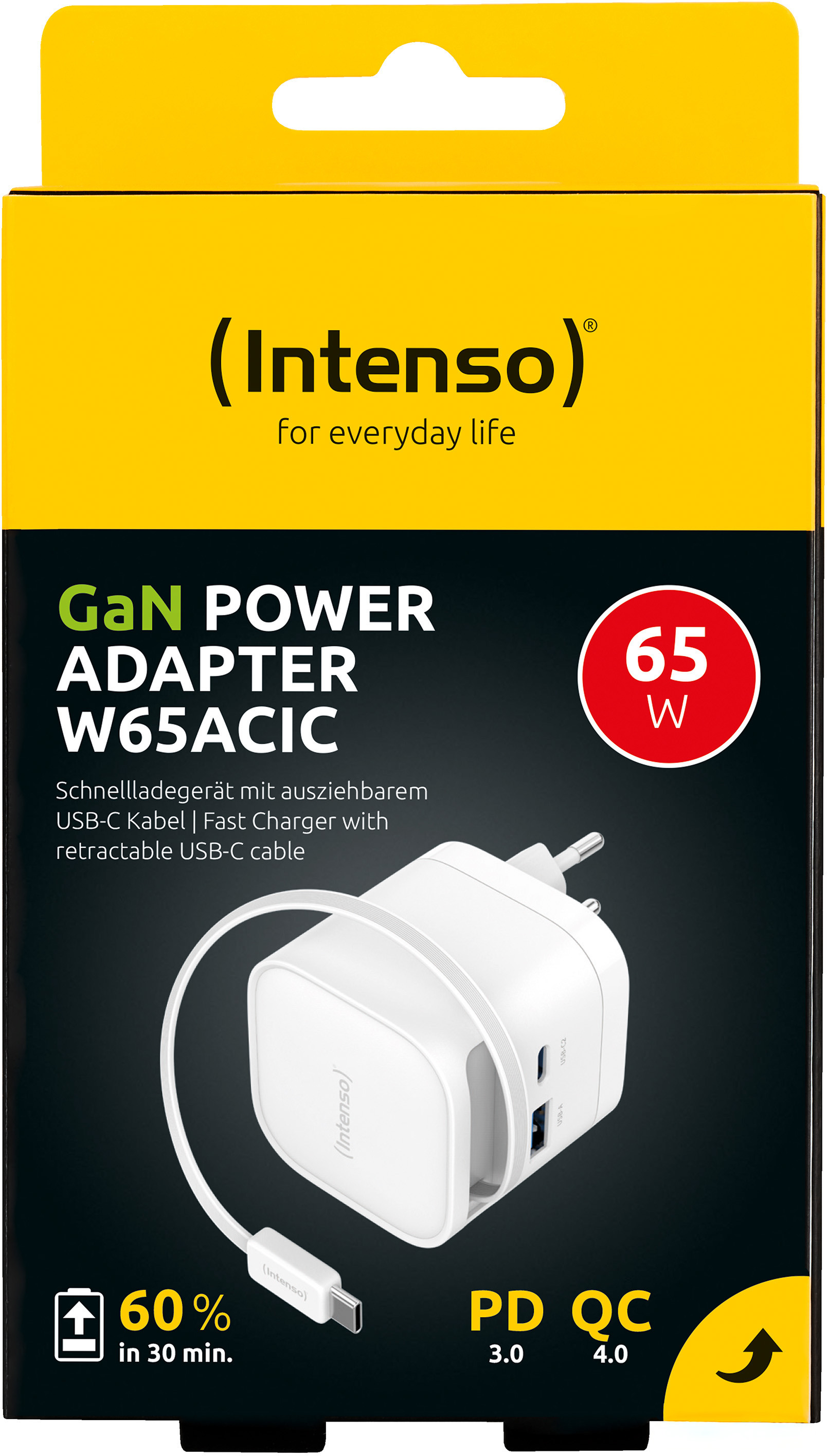 Der Intenso Power Adapter W65ACIC GaN ist ein leistungsstarkes und kompaktes Schnellladegerät für den täglichen Einsatz. Mit bis zu 65 W Ausgangsleistung lädt er Smartphones, Tablets und Notebooks zuverlässig und besonders schnell. Dank Unterstützung von Power Delivery 3.0, PPS und Quick Charge 4.0 werden moderne Geräte optimal versorgt. Das integrierte, ausziehbare 70 cm USB-C-Kabel sowie zusätzliche USB-C- und USB-A-Anschlüsse ermöglichen das gleichzeitige Laden mehrerer Geräte mit hoher Effizienz. Die moderne GaN-Technologie sorgt für eine verbesserte Energieeffizienz bei gleichzeitig geringer Wärmeentwicklung. Dadurch bleibt das Ladegerät besonders kompakt und leicht, ohne an Leistung einzubüssen. Mit einer Effizienz von über 78 % und einem Standby-Verbrauch von unter 0,3 W überzeugt der Adapter auch in puncto Nachhaltigkeit. Das robuste Gehäuse, das platzsparende Format und das geringe Gewicht machen ihn zum idealen Begleiter für Zuhause, Büro oder unterwegs. Erhältlich in Schwarz oder Weiss und passend für jede EU-Steckdose.