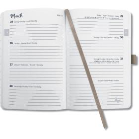 Der Wochenkalender Jolie im Hardcover-Einband aus weichem PU-Material mit geprägtem Design enthält 174 Seiten, inklusive Notizseiten (12 Blatt perforiert zum Heraustrennen). Das Kalendarium zeigt je eine Woche auf einer Doppelseite. Zusätzlich enthält der